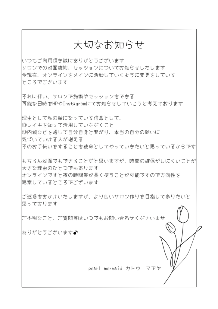 こんにちは春らしい気候となりましたね4月ということで公式LINEの特典を変更しました『500縁券』となっておりますぜひご登録の上、こ活用ください♪公式LINE⇩5月より『レイキを楽しもう!』をコンセプトにレイキ練習会を開催予定ですこちらも公...